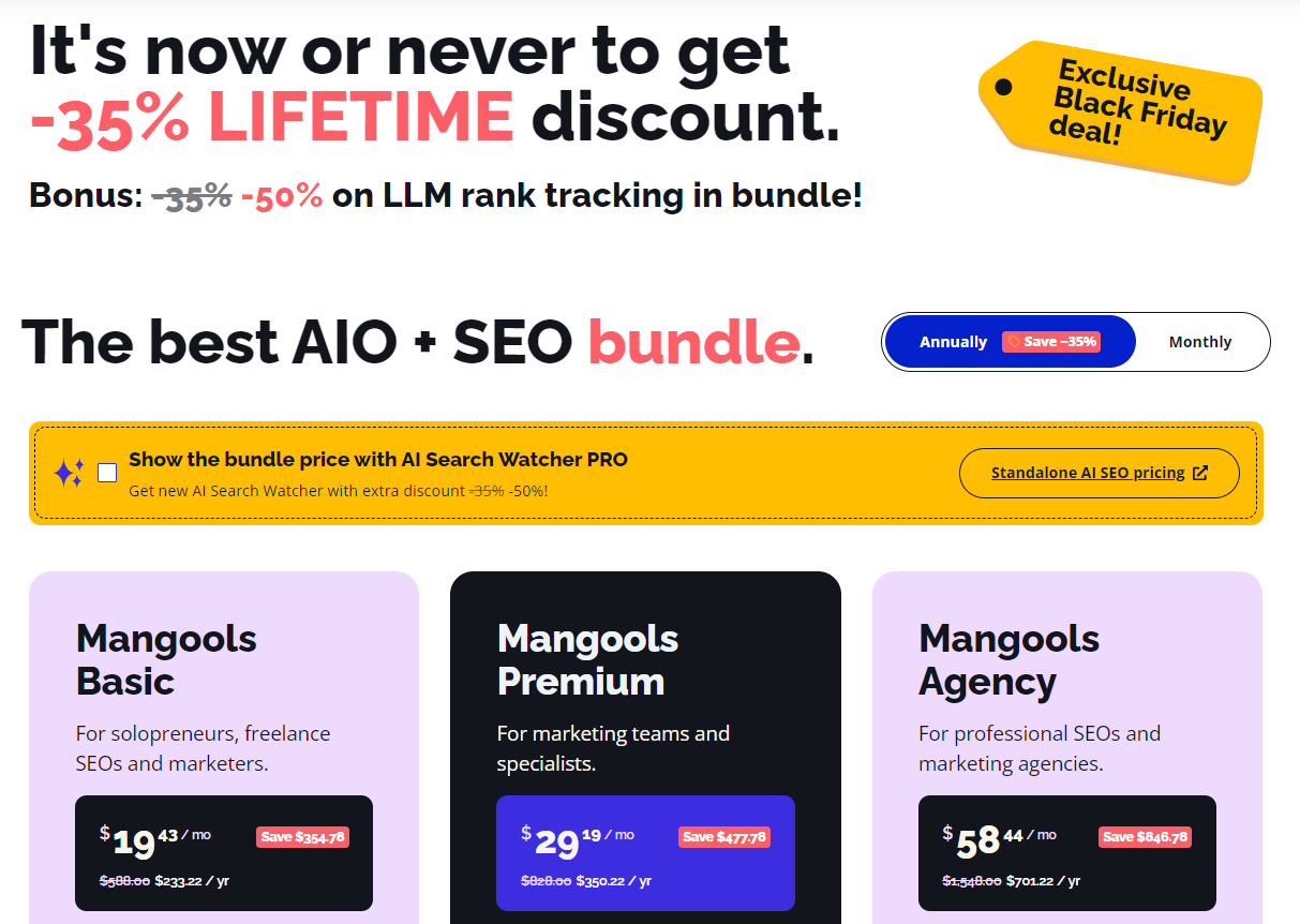 Halte die Augen nach Black-Friday-Deals bei Mangools* offen, das lohnt sich! Dann zahlst du für das jährlichen Basic Paket nur noch etwa 18 Euro statt 29 Euro!